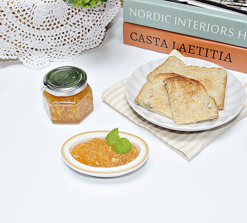 잼을 만들면서 빵에 발라서 맛을 봤습니다. 향이 너무 좋아서 그냥 빵에 발라먹어도 맛이 너무 좋았어요. 몇 개만 만들어도 한동안 보관할 수 있을 만큼 만들었기 때문에 모양이나 색상이 덜 예쁜 것들을 골라서 사진에는 4개가 있지만 5개를 만들었습니다. 가을철에 만들면 더욱 풍미가 좋은 사과잼 만드는 방법입니다.