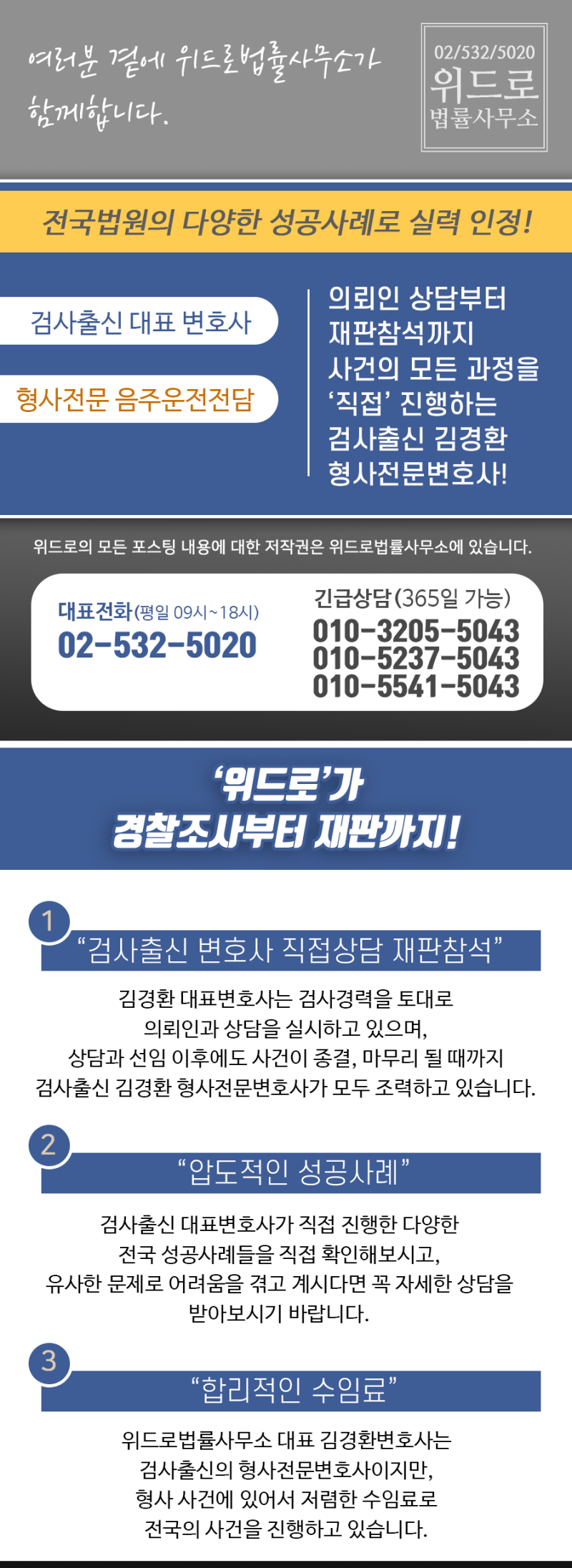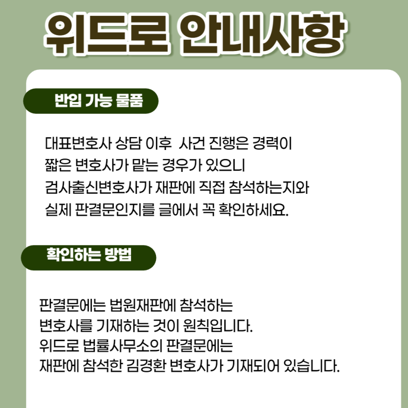 김경환 대표변호사는 전라남도 영암경찰서에 출두하기 전 의뢰인과 사건 경위를 상의하고, 경찰 수사에서 불리한 진술 없이 수사가 마무리될 수 있도록 진술 준비를 도왔다. , 설문조사에서 어떤 답변을 드려야 할지 막막했지만 Wero 설문조사 시뮬레이션을 통해 제 입장이 잘 전달되어 성실하게 설문조사를 마칠 수 있었습니다. 이어 기소 단계에서 김경환 형사변호사는 음주운전 경위, 음주운전 사고 경위, 상습 음주운전 가해자의 부당한 부분, 양형 선고 등을 종합해 관할 검찰청에 제출했다. 목포지청 공판 당일 김경환 전 검사 김경환 변호사가 직접 법정에 나와 의뢰인 P가 음주운전으로 보호관찰을 받아야 하는 이유를 자세히 설명했다. 판사는 본론을 듣고 양형 날짜를 정하고 공판을 종결했다. P씨와 가족들은 음주운전 재판이 열리는 날 이름이 호명되기를 애타게 기다렸다. 3차 파업에 연루된 피고인들이 구속되면서 우려가 커지고 있는 것으로 전해졌다. 기다린 끝에 집행유예 선고와 불구속 관대한 처우를 확인한 P씨의 이름을 들은 의뢰인은 안도하며 사건에 대해 깊이 반성하고 재판을 마무리했다.
