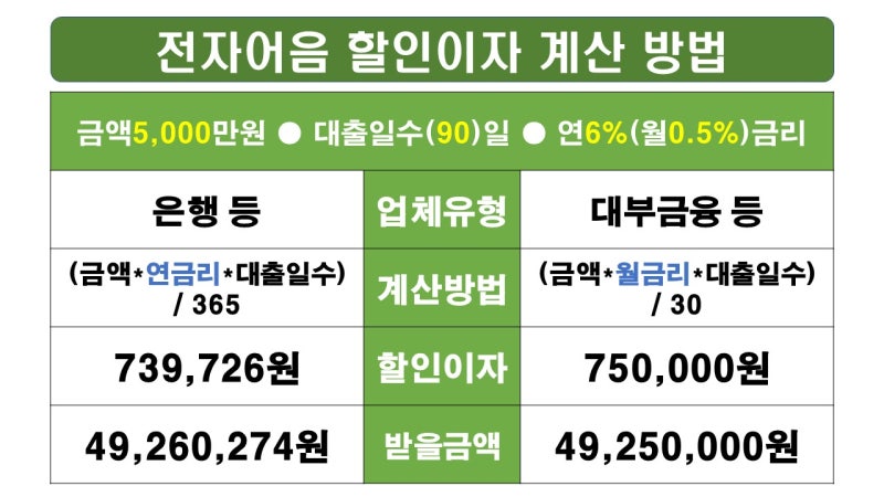 전자어음을 거래할 때 대부분의 사람들이 궁금해하는 것이 발행회사의 이자율과 수수료 정보라고 생각합니다. 발행사명, 대표자명, 사업자등록번호, 어음할인금액, 만기일, 어음할인예정일을 알려주시면 10분 이내에 수수료와 이자율을 정확하게 확인하실 수 있으며, 모든 사항을 안내해 드립니다. 투명하고 정직하게. 그리고 전자청구서. 지금부터 은행과 회사가 어떻게 다른지, 할인을 이용할 수 있는 조건은 무엇인지 자세히 알려드리겠습니다.